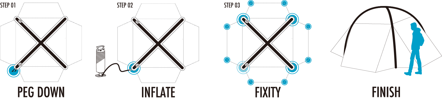 ANDAIRの『AIRFRAME PURODUCT』は、アウトドアシーンでの利便性と快適性を追求しながら、通常のフレームテントと同様の強度と快適性を保つための研究を重ねてきました。U字のみのエアーフレーム構成ではなく「Xfarme」を採用する事で、強風による横揺れ、設置面の傾斜などに影響されづらい安定感のあるスペースの確保しながら、設営・撤収にかかる手間と時間をできる限り短縮した構造になっています。