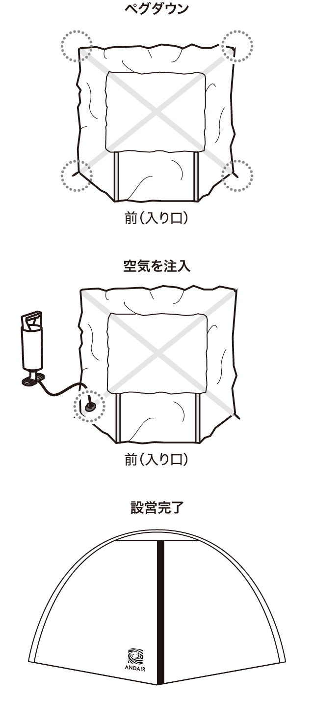 『HAND-01』はX型AirFrameや65D防水加工ポリエステルの天幕、裏面をPUコーティングしたフライシート(耐水圧 3,000mm)インナー床面にはポリエステル 210D(耐水圧 3,000mm)を採用したこれまでの仕様を踏襲し、さらにソロキャンプに特化したモデル。X型AirFramのみの構成により、コンパクトながら十分な居住空間を確保し、広めに設けられた前室を利用する事で、スペースを妨げる事なく快適なソロキャンプが楽しめます。U型AirFrameを省いたことにより設営はよりシンプルに、ANDAIRのテントで随一の手軽さに仕上がっております。